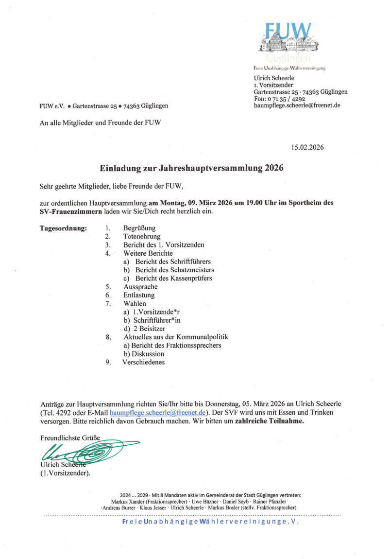 Hauptversammlung 2026 Jahreshauptversammlung 2026 der FUW Güglingen  Zur Jahreshauptversammlung der FUW Güglingen am 09. März fanden sich 25 Teilnehmerinnen und Teilnehmer im Sportheim des SV Frauenzimmern ein. Der 1.Vorsitzende Ulrich Scheerle begrüßte die Anwesenden. Beim Jahresrückblick stand vor allem ein doppeltes Jubiläum im Mittelpunkt: Der Verein FUW konnte im vergangenen Jahr auf 30-jähriges und die Gemeinderatsfraktion bereits auf 50-jähriges Bestehen zurückblicken. Dies wurde mit einem Sommerfest am 26. Juli 2025 gebührend gefeiert.   Werner Gutbrod bedankte sich für die hervorragende Arbeit des Vereinsvorstands. Er hob hervor, dass immer weniger Menschen bereit sind, ihre Zeit fürs Ehrenamt einzubringen. Anschließend beantragte er die Entlastung des Vorstandes, die von den Anwesenden einstimmig erteilt wurde. Bei den anstehenden Wahlen gab es folgende Ergebnisse: Ulrich Scheerle wurde in seinem Amt als 1.Vorsitzender wiedergewählt, das er bereits seit 2016 ausübt. Markus Bosler als Schriftführer sowie Andreas Burrer und Norbert Buttau als Beisitzer wurden ebenfalls in ihren Ämtern bestätigt.   Fraktionssprecher Markus Xander gab daraufhin einen Überblick über aktuelle Themen der Gemeinderatsarbeit. Hierzu wurden bei der anschließenden lebhaften Diskussion zahlreiche Fragen gestellt. Zu einigen Punkten konnte auch Bürgermeister Michael Tauch Auskunft geben, der als Gast an der Versammlung teilnahm. Gegen 21.30 Uhr beschloss Ulrich Scheerle die Sitzung. Er bedankte sich bei allen Anwesenden für ihr Kommen und beim Helferteam des SVF für die hervorragende Bewirtung. Historie