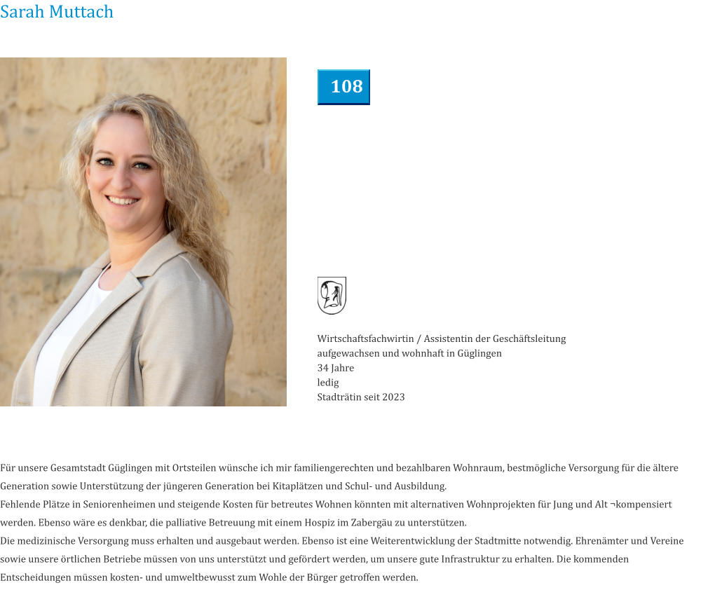 Sarah Muttach Wirtschaftsfachwirtin / Assistentin der Geschäftsleitung aufgewachsen und wohnhaft in Güglingen 34 Jahre ledig  Stadträtin seit 2023            Für unsere Gesamtstadt Güglingen mit Ortsteilen wünsche ich mir familiengerechten und bezahlbaren Wohnraum, bestmögliche Versorgung für die ältere Generation sowie Unterstützung der jüngeren Generation bei Kitaplätzen und Schul- und Ausbildung. Fehlende Plätze in Seniorenheimen und steigende Kosten für betreutes Wohnen könnten mit alternativen Wohnprojekten für Jung und Alt ¬kompensiert werden. Ebenso wäre es denkbar, die palliative Betreuung mit einem Hospiz im Zabergäu zu unterstützen. Die medizinische Versorgung muss erhalten und ausgebaut werden. Ebenso ist eine Weiterentwicklung der Stadtmitte notwendig. Ehrenämter und Vereine sowie unsere örtlichen Betriebe müssen von uns unterstützt und gefördert werden, um unsere gute Infrastruktur zu erhalten. Die kommenden Entscheidungen müssen kosten- und umweltbewusst zum Wohle der Bürger getroffen werden.  Kommunalwahl 2024 108