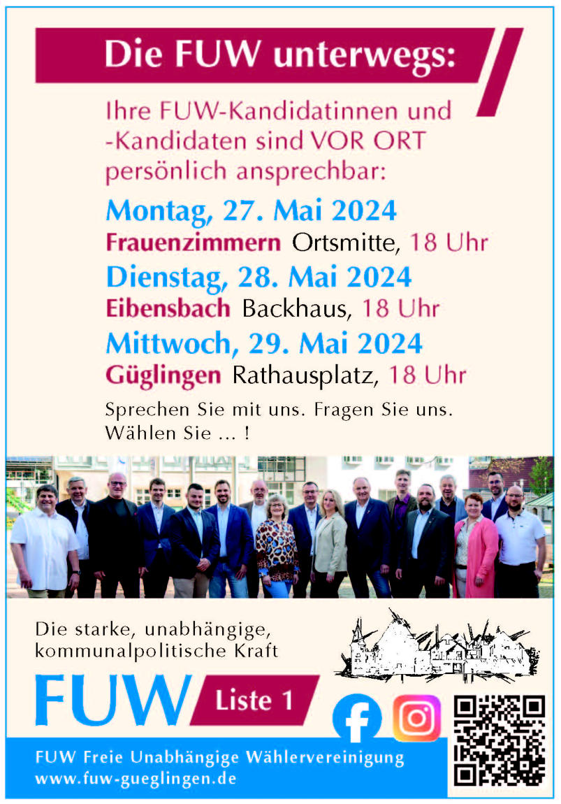 Lernen Sie uns kennen Die 17 Kandidatinnen und Kandidaten der Liste 1 - Lernen Sie uns kennen!  Die FUW tritt mit acht aktuellen Mitgliedern des Gemeinderats und neun neuen Kandidaten zur Kommunalwahl am 09. Juni an. Die Kurzvorstellung aller Kandidierenden können Sie dieser Ausgabe der Rundschau als Gesamtübersicht entnehmen. Wenn Sie die Bewerberinnen und Bewerber der FUW näher kennenlernen möchten, bieten wir Ihnen verschiedene weitere Informationsmöglichkeiten an:  FUW ONLINE Eine ausführlichere Kandidatenvorstellung finden Sie auf der Homepage www.fuw-gueglingen.de sowie auf den entsprechenden Facebook und Instagram-Seiten. Hier können Sie herausfinden, für welche Überzeugungen und thematischen Schwerpunkte die einzelnen Personen stehen. Dort findet sich auch eine kurze Videosequenz, in der sich jede Bewerberin/jeder Bewerber mit einigen persönlichen Bildern vorstellt. Anhand dieser Impressionen können Sie zusätzlich erfahren, wie die Kandidaten ihre Freizeit verbringen, welche Hobbys und Interessen sie haben und welche Themen ihnen besonders wichtig sind.  FUW UNTERWEGS Wenn Sie die Kandidierenden gerne persönlich kennenlernen möchten, dann kommen Sie zu den Vor-Ort-Terminen! Die FUW ist an folgenden Terminen in den Güglinger Stadtteilen präsent: •	Montag, 27. Mai 2024, 18 Uhr in der Frauenzimmerner Ortsmitte (Dorfplatz am Backhaus) •	Dienstag, 28. Mai 2024, 18 Uhr am Backhaus in Eibensbach •	Mittwoch, 29. Mai 2024, 18 Uhr am Güglinger Rathausplatz. Kommen Sie vorbei, sprechen Sie mit uns, fragen Sie uns! Historie
